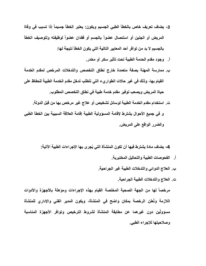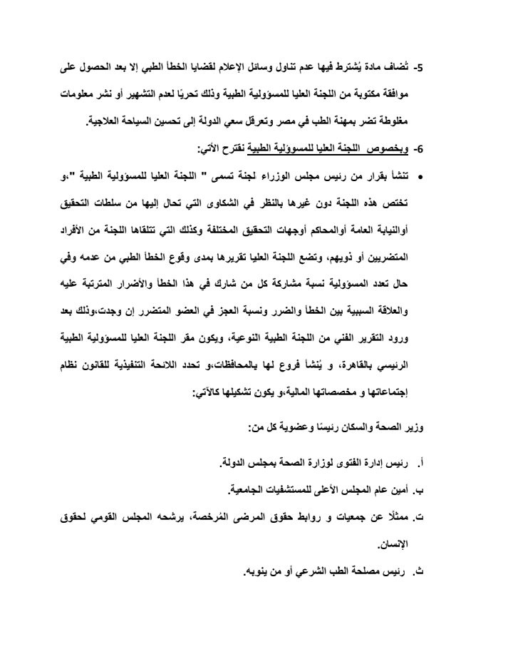 ٢- ضرورة النص على تشكيل لجان نوعية طبية تفحص قضايا الخطأ الطبي وتضع تقريرها.