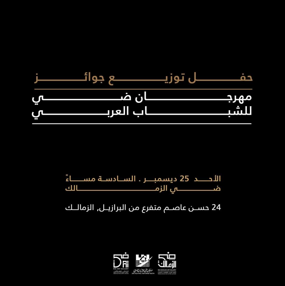 جاليري ضي، يقيم أتيليه العرب للثقافة والفنون برئاسة الناقد التشكيلي هشام قنديل، في السادسة من مساء غد الأحد، بجاليري ضي الزمالك، حفل توزيع جوائز المهرجان الرابع للشباب العربي.