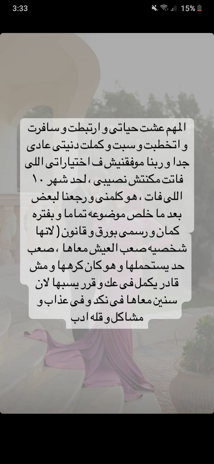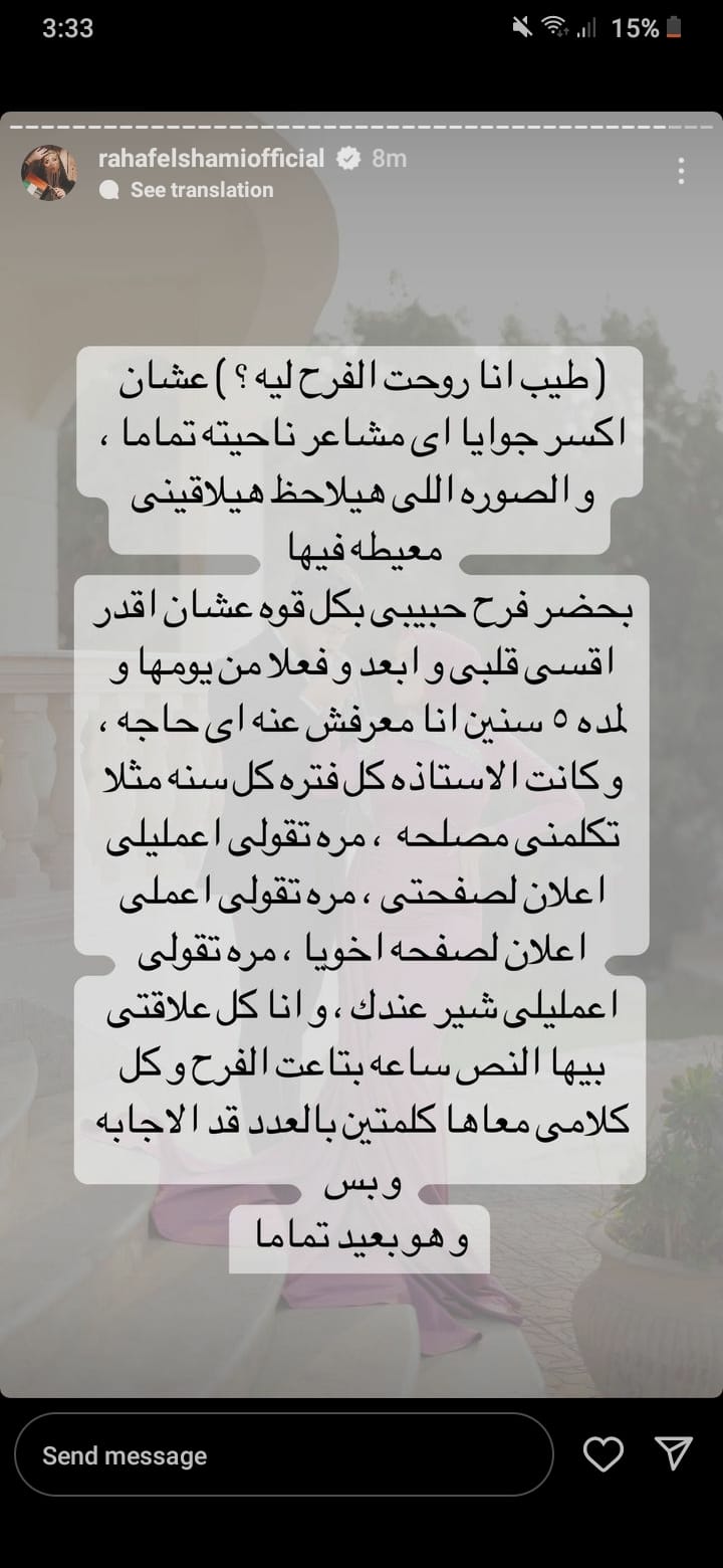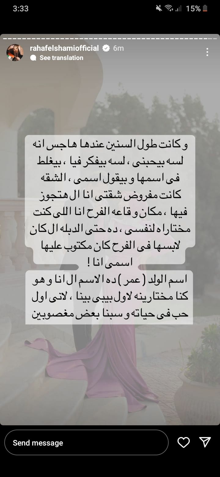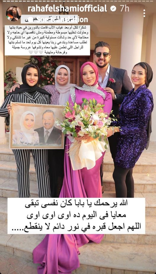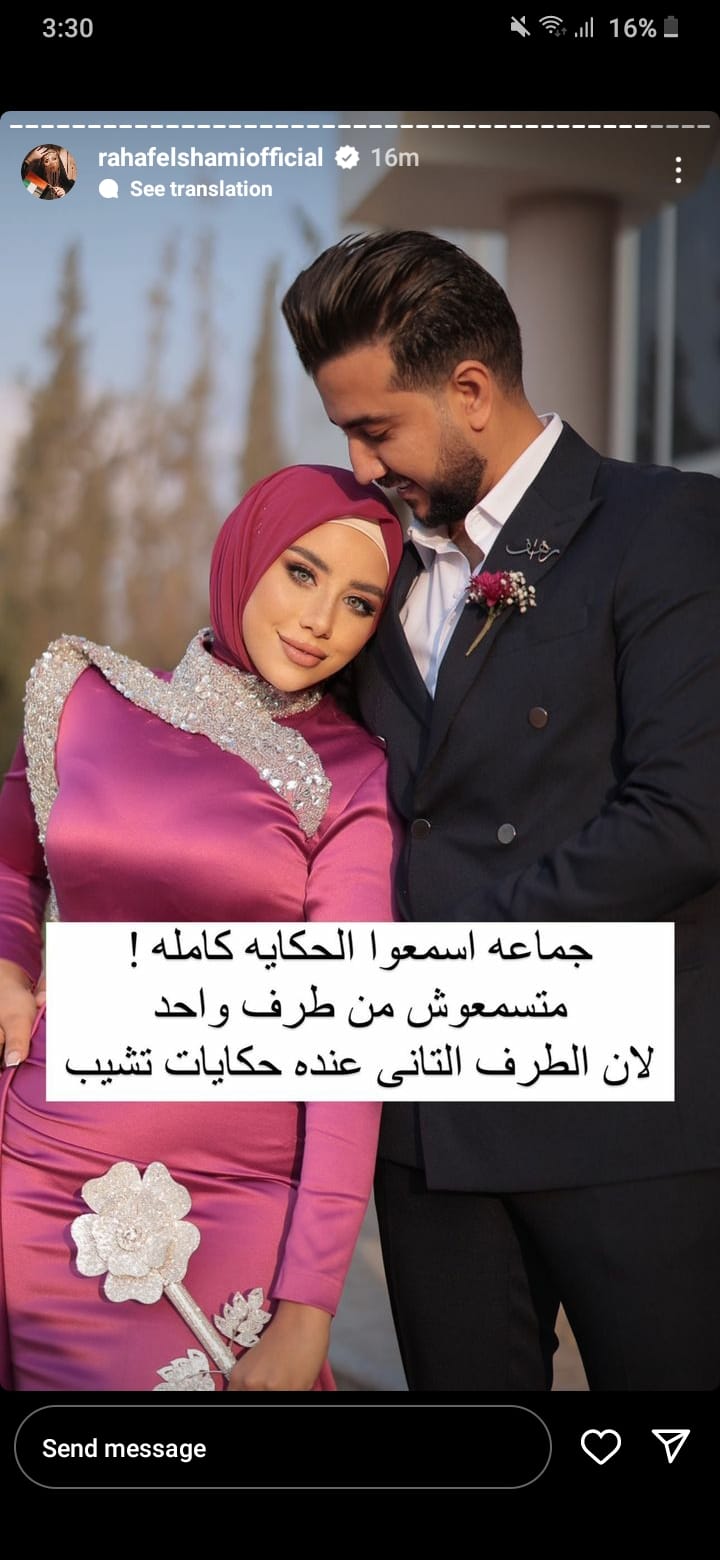 وقالت البلوجر رهف الشامي: "وفعلًا سبنا بعض وبابا رجعله الشبكه كمان، وبعدها الاستاذة اتخطبت له، أنا بعدت عنه نهائي لمدة سنة ونصف أو سنتين، واتكلمنا أنا وهو لما اتعزمت على الفرح فقط، وكان أول مرة أشوف الاستاذة، وهي جريت عليا قالت أنا مش مصدقة إن رهف الشامي موجودة في فرحي بحبك أوي ومتابعاكي دايمًا..."