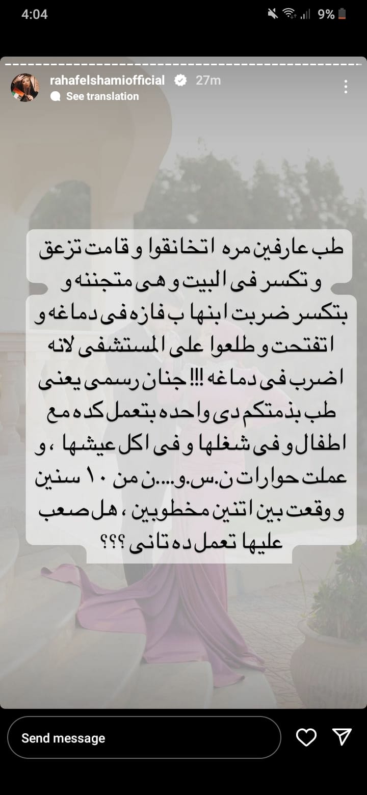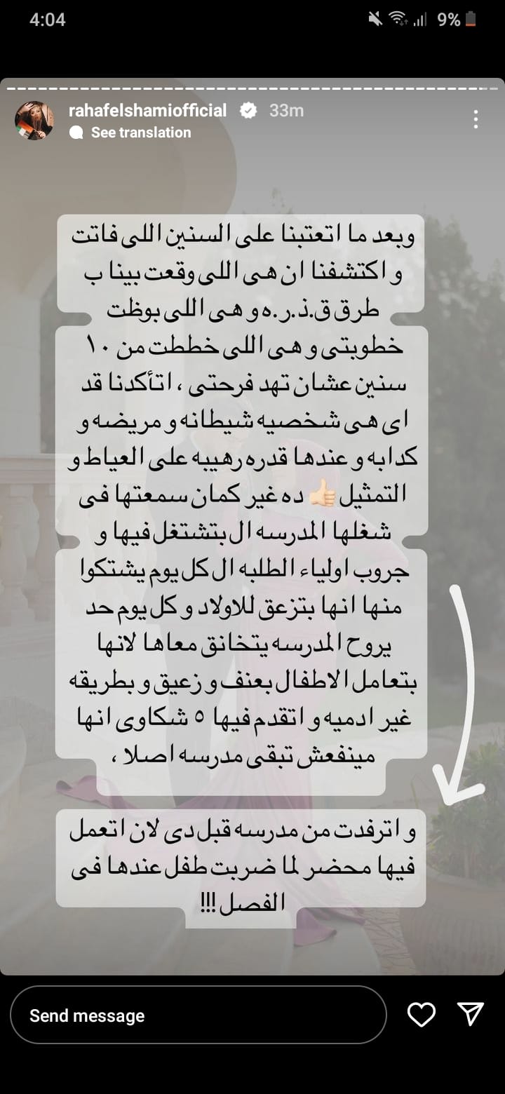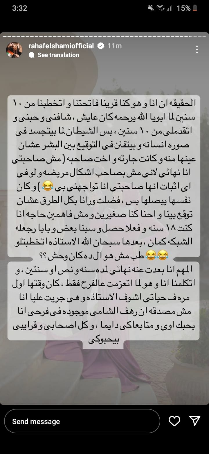 وتابعت رهف الشامي حكايتها قائلة: "بس الشيطان لما يتجسد في صورة إنسان ويوقع بين البشر عشان عينها منه، وكانت جارته وأخت صاحبه (مش صاحبتي أنا نهائي، لأني مش بصاحب أشكال مريضة، ولو فيه أي إثبات أنها صاحبتي أنا تواجهني بيه)، فضلت ورانا بكل الطرق عشان توقع بينا واحنا كنا صغيرين ومش فاهمين حاجة أنا كنت 18 سنة"