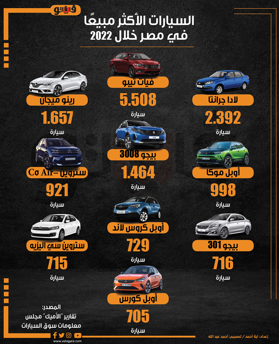 السيارات الأكثر مبيعًا في مصر خلال 2022 (إنفوجراف) الأحد 01/يناير/2023 - 12:15 م 1/1/2023 12:15:14 PM السيارات الأوروبية، فيتو آية أحمد شارك طباعة 18 حجم الخط شارك طباعة اوبل كروس لاند سيارة أوبل كروس لاند رينو ميجان سيارات اوروبية