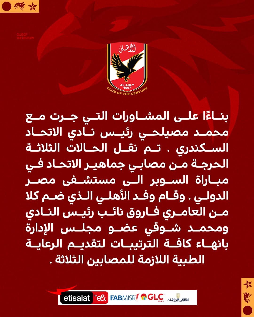 وأكد بيان النادي الأهلي: "بناءً على المشاورات التي جرت مع محمد مصيلحي رئيس نادي الاتحاد السكندري، تم نقل الحالات الثلاث الحرجة من مصابي جماهير الاتحاد في مباراة السوبر إلى مستشفى مصر الدولي".