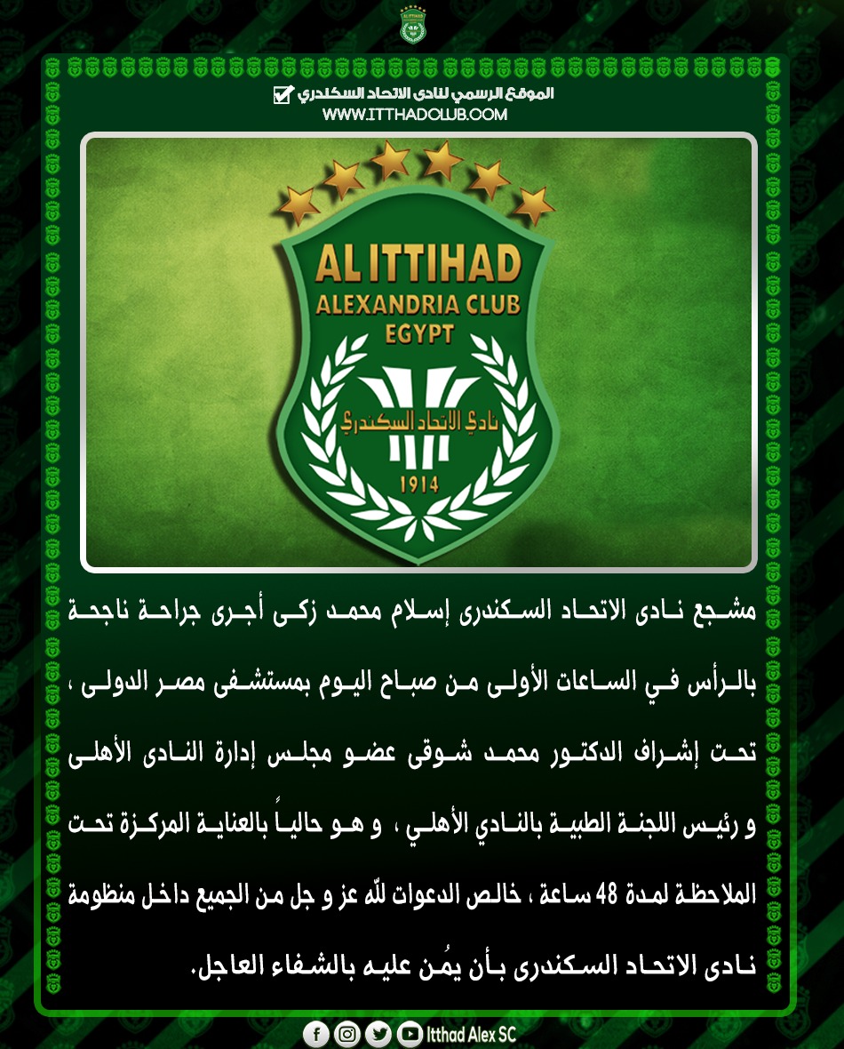 وجاء في البيان، أن العملية الجراحية تمت تحت إشراف الدكتور محمد شوقي عضو مجلس إدارة النادي الأهلي.