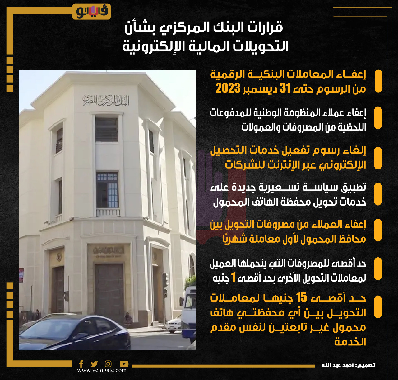 قرارات البنك المركزي بشأن التحويلات المالية الإلكترونية (إنفوجراف) الأحد 25/ديسمبر/2022 - 03:00 م 12/25/2022 3:00:36 PM البنك المركزي المصري شارك طباعة 18 حجم الخط شارك طباعة البنك المركزى التحصيل الإلكتروني البنك المركزى المصرى الهاتف المحمول المنظومة الوطنية للمدفوعات اللحظية