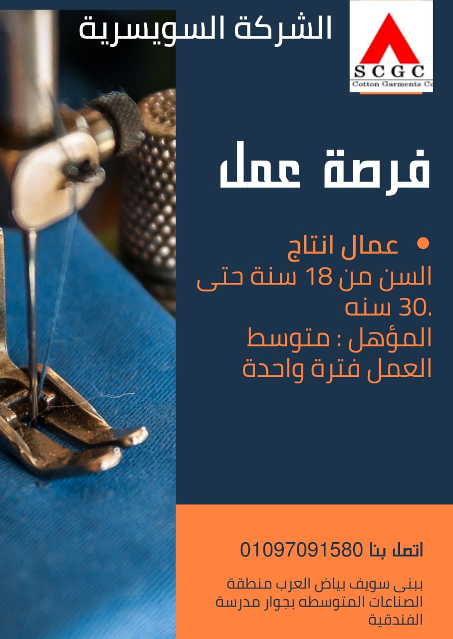 أعلنت مديرية القوى العاملة بمحافظة بني سويف، عن توفير 100 فرصة عمل، من عمال الإنتاج بالشركة السويسرية SCGC، من الذكور والإناث، والسن يتراوح من 18 الى 30 عاما.