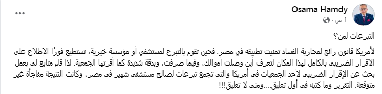 وتابع في منشوره: " لذا قام متابع لي بعمل بحث عن الإقرار الضريبي لإحدى الجمعيات في أمريكا والتي تجمع تبرعات لصالح مستشفى شهير في مصر، وكانت النتيجة مفاجأة غير متوقعة".