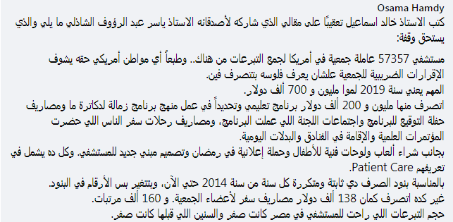 وأشار أستاذ أمراض الباطنة والسكر، إلى ما كتبه الأستاذ خالد إسماعيل تعقيبًا على دعوات مستشفى سرطان الأطفال 57357، والتي جاء فيها: " مستشفي 57357 عاملة جمعية في أمريكا لجمع التبرعات من هناك.. وطبعًا أي مواطن أمريكي حقه يشوف الإقرارات الضريبية للجمعية علشان يعرف فلوسه بتتصرف فين".