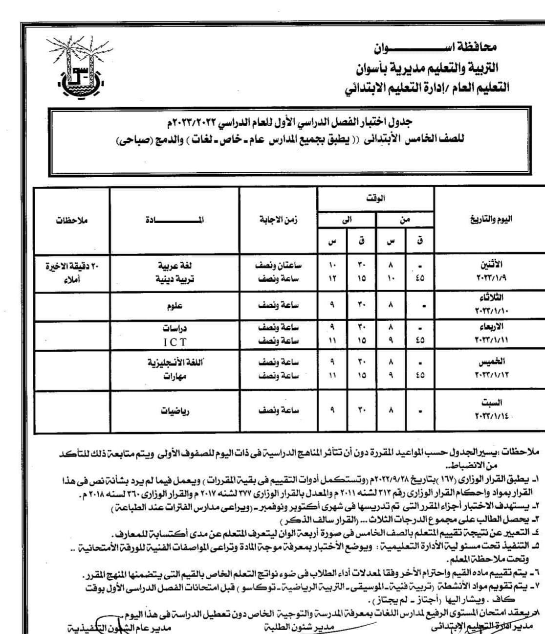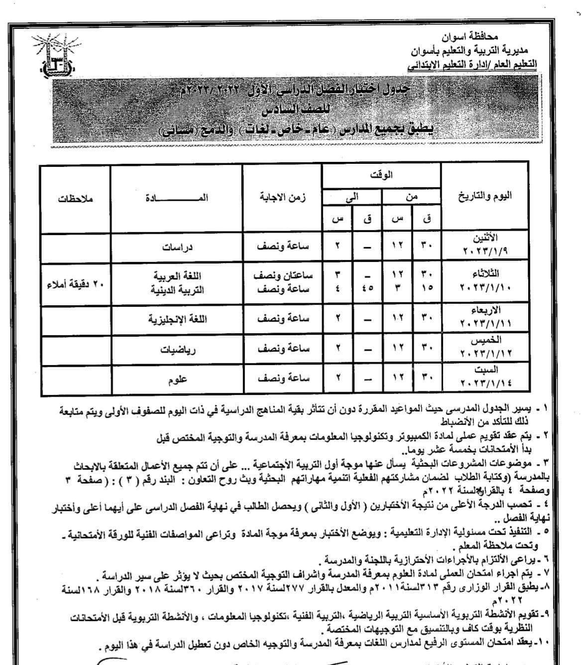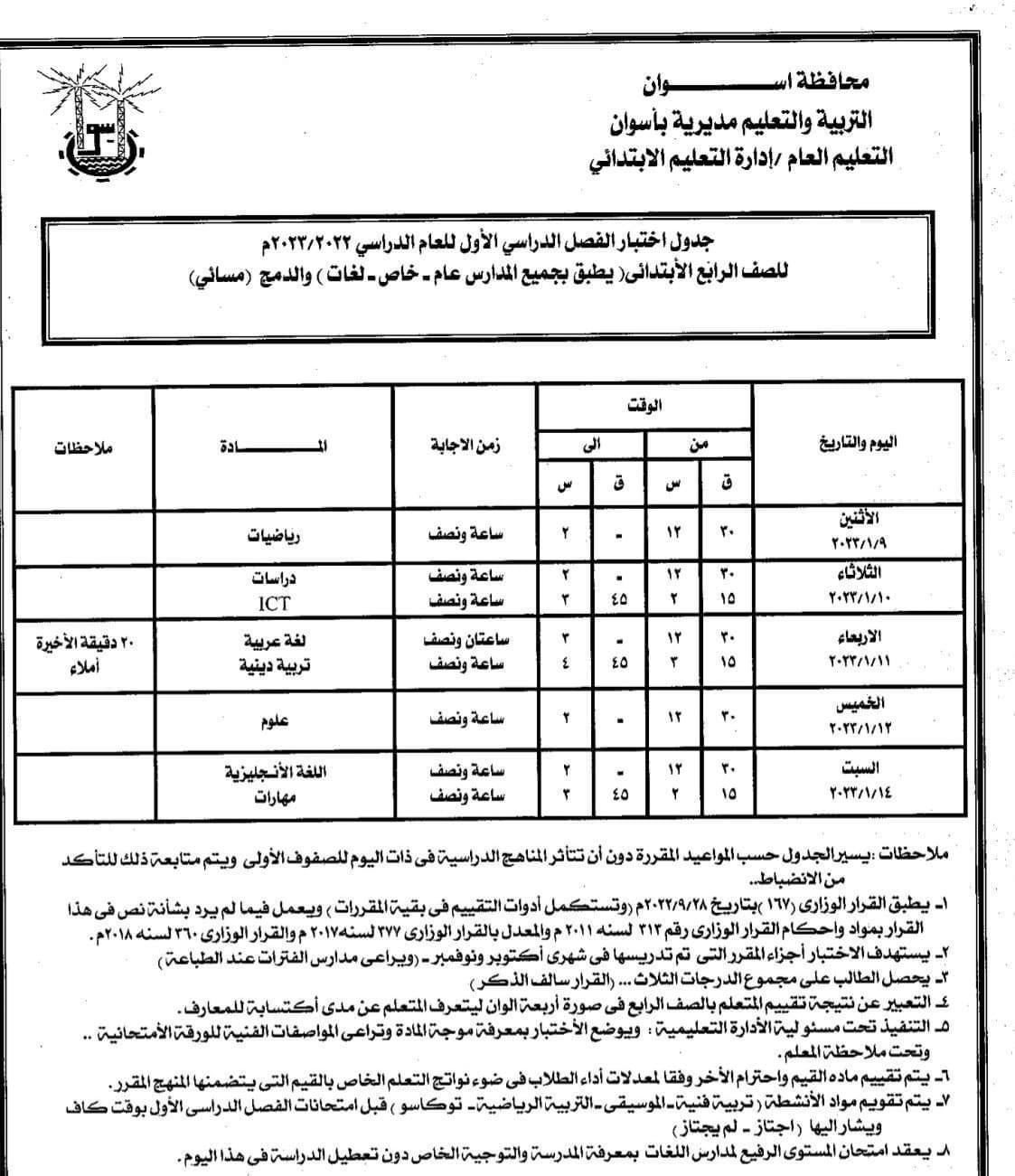 أعلنت مديرية التربية والتعليم بأسوان عن جداول امتحانات الفصل الدراسي الأول للصفوف (الرابع، الخامس، السادس) الابتدائي للعام الدراسي ٢٠٢٣/٢٠٢٢.