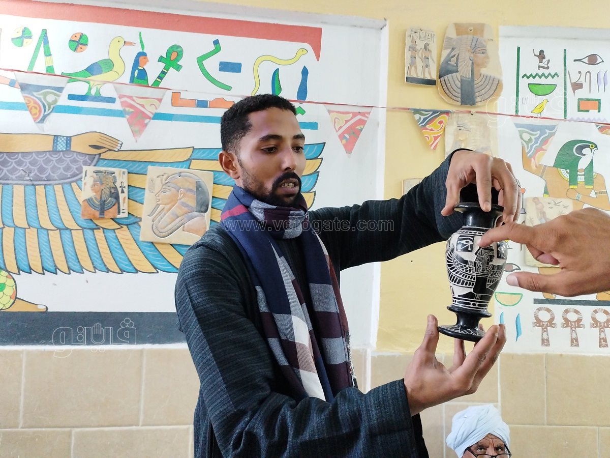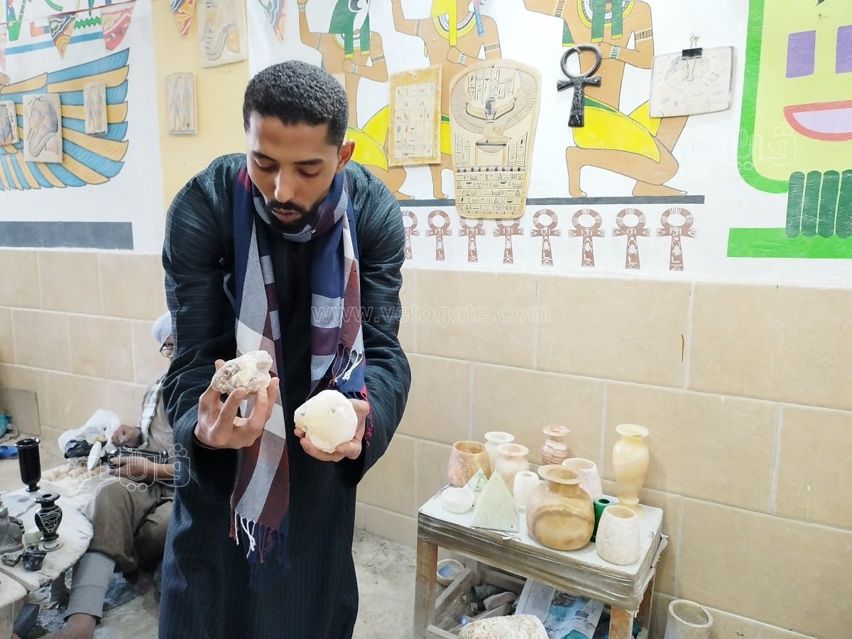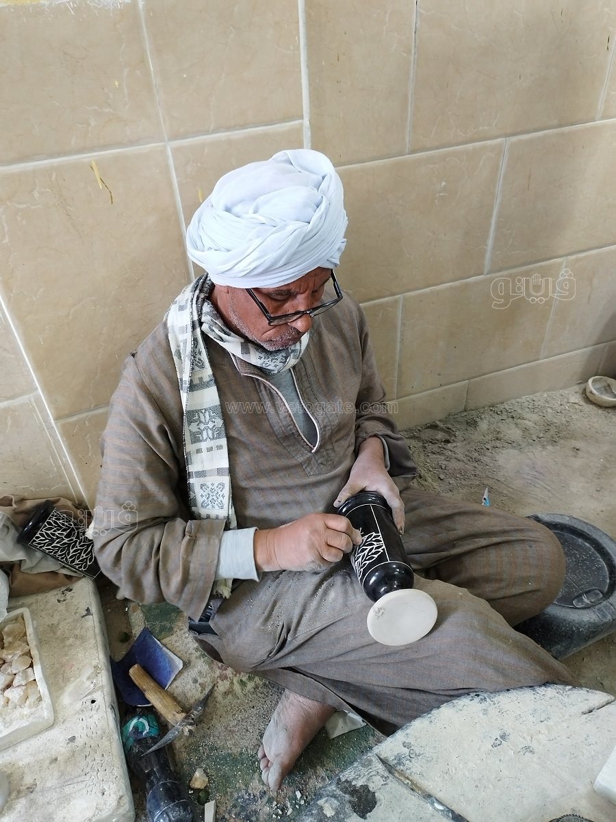 “فيتو” التقت العم همام حمزة ستيني العمر الذي لا يزال يعمل جالسا على الأرض يصنع التحف الفنية للسائحين.
