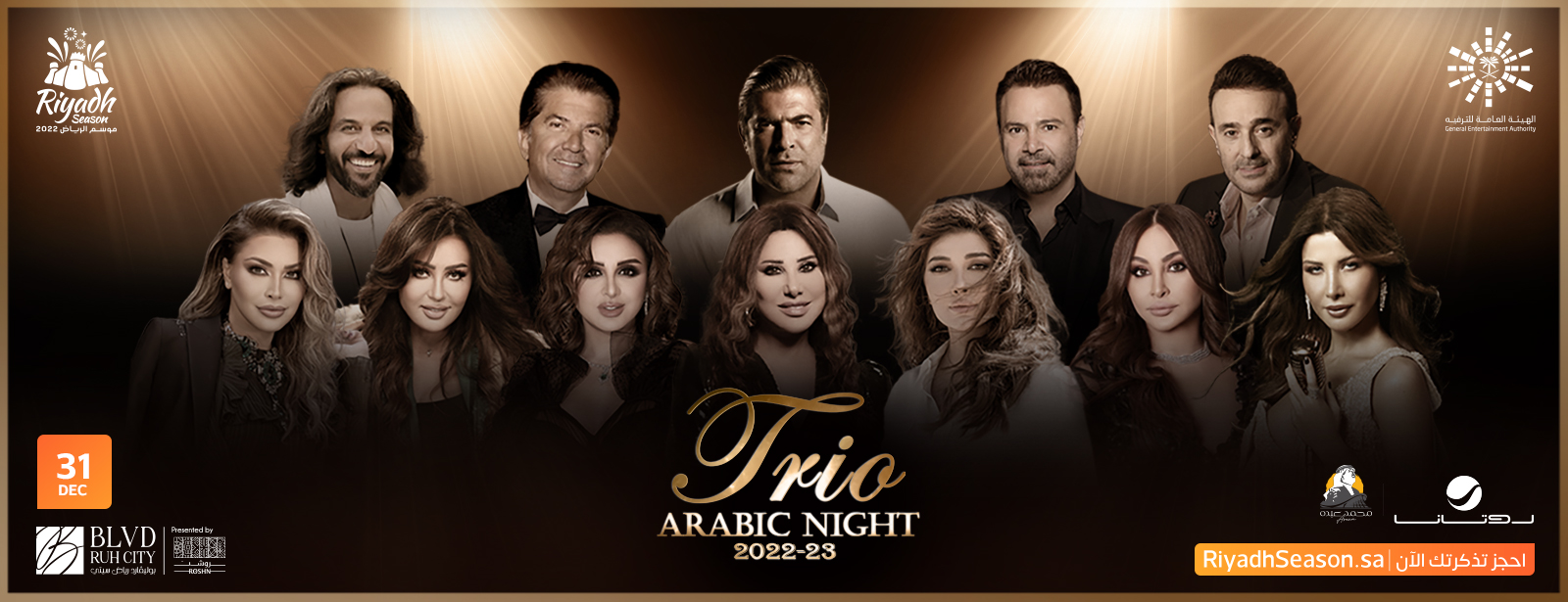 ويُحيي عدد من نجوم الفن بالوطن العربي، ليلة تريو العربية بموسم الرياض ليلة رأس السنة، وهم: المطربة اللبنانية نانسي عجرم، المطربة اللبنانية إليسا، المطربة السورية أصالة نصري،اللبنانية نجوى كرم، المطربة المصرية أنغام، التونسية لطيفة، نوال الزغبي، التونسي صابر الرباعي، اللبناني وائل كفوري، عاصي الحلاني، الفنان المصري بهاء سلطان، وليد توفيق في مسرح محمد عبده أرينا بتاريخ 31 ديسمبر ضمن فعاليات البوليڤارد رياض سيتي.