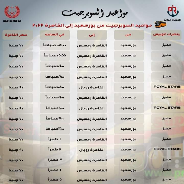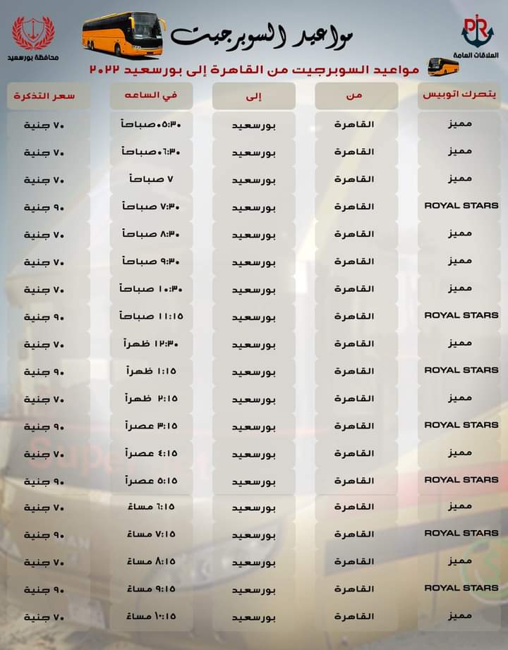 اسعار السوبر جيت، أعلنت محافظة بورسعيد عن مواعيد السوبر جيت من محافظة بورسعيد إلى محافظة القاهرة والعكس 2022