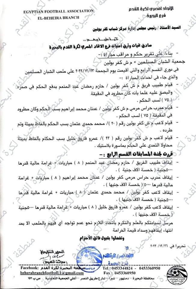 اتحاد الكرة، قرر الاتحاد المصري لكرة القدم وضع عقوبات صارمة بدوري القسم الرابع بالبحيرة بعد أحداث مباراة جمعية الشبان المسلمين ضد فريق مركز شباب كفر بولين