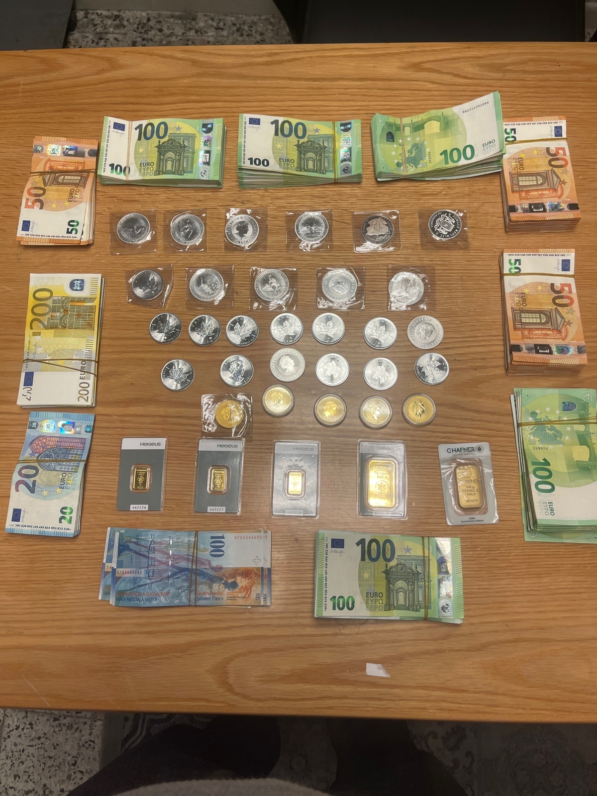 وقام مهند سامى المشرف على صالة السفر، بتكليف محمد أبو بكر رسلان مأمور الجمرك المعين بصالة السفر، بتفتيش حقائب فتبين وجود 86 ألف يورو و1400 فرنك سويسري و5 جنيهات ذهبية و5 سبائك من الذهب و24 جنيه فضى.