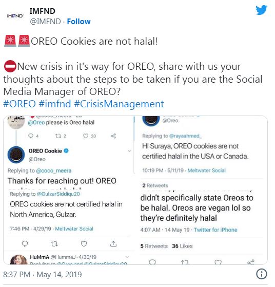 "أوريو ليست حلالًا. شكرًا على رسالتك"، كانت هذه الكلمات تغريدة مقتضبة نسبت لشركة أوريو Oreo على تويتر يوم 11 مايو 2019، فى سياق ردها على سؤال أحد المستخدمين على حساب أوريو بموقع التواصل الاجتماعى