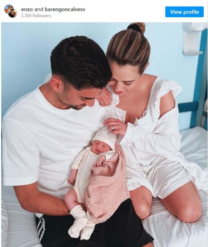 وفي وقت سابق، كشف إنزو أن كارين أنجبت له فتاة، وكتب على “انستجرام”: “أهلا سيا يا أميرتنا. 2022/5/19″، كما شارك صورة له مع زوجته يحتضنان طفلتهما حديثة الولادة.