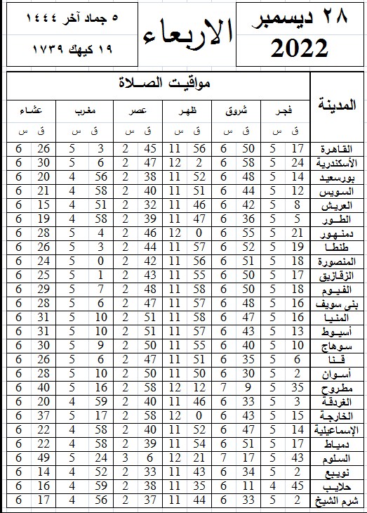 مواقيت الصلاة اليوم القاهرة والمحافظات