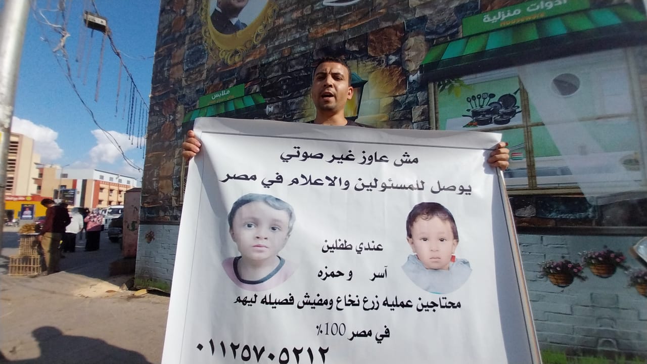 وقف شاب يدعى محمد رشاد عثمان 36 عاما عامل من قرية برديس بمركز البلينا بمحافظة سوهاج أمام أستاذ الرياضى بمحافظة سوهاج رافعا لافتة كتب عليها (مش عايز غير صوتي يوصل للمسئولين والإعلام عندي طفلين آسر وحمزة محتاجين لعملية زرع نخاع مفيش فصيلة ليهم في مصر 100%).
