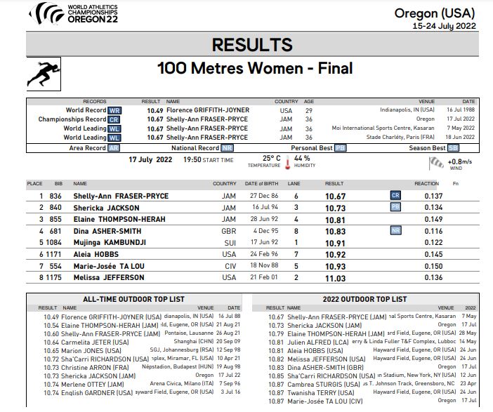 وجاءت المراكز الـ8 الأولى في سباق 100 متر عدو سيدات ببطولة العالم الحالية كالتالي: