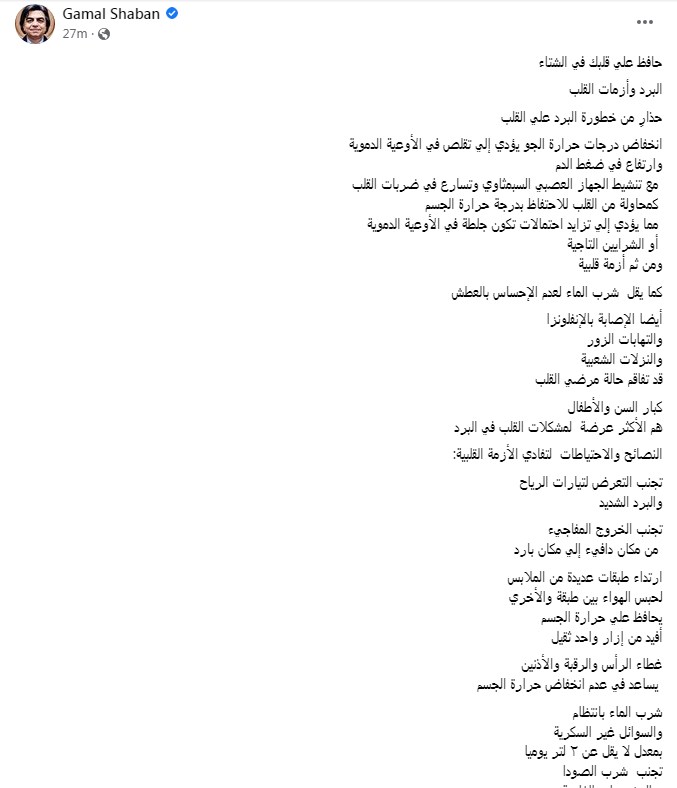 وعن خطورة التعرض للبرد، كتب الدكتور جمال شعبان محذرًا من الأزمة القلبية في الشتاء، عبر صفحته بالفيس بوك قائلًا: "حافظ على قلبك في الشتاء، البرد وأزمات القلب، حذارِ من خطورة البرد علي القلب"
