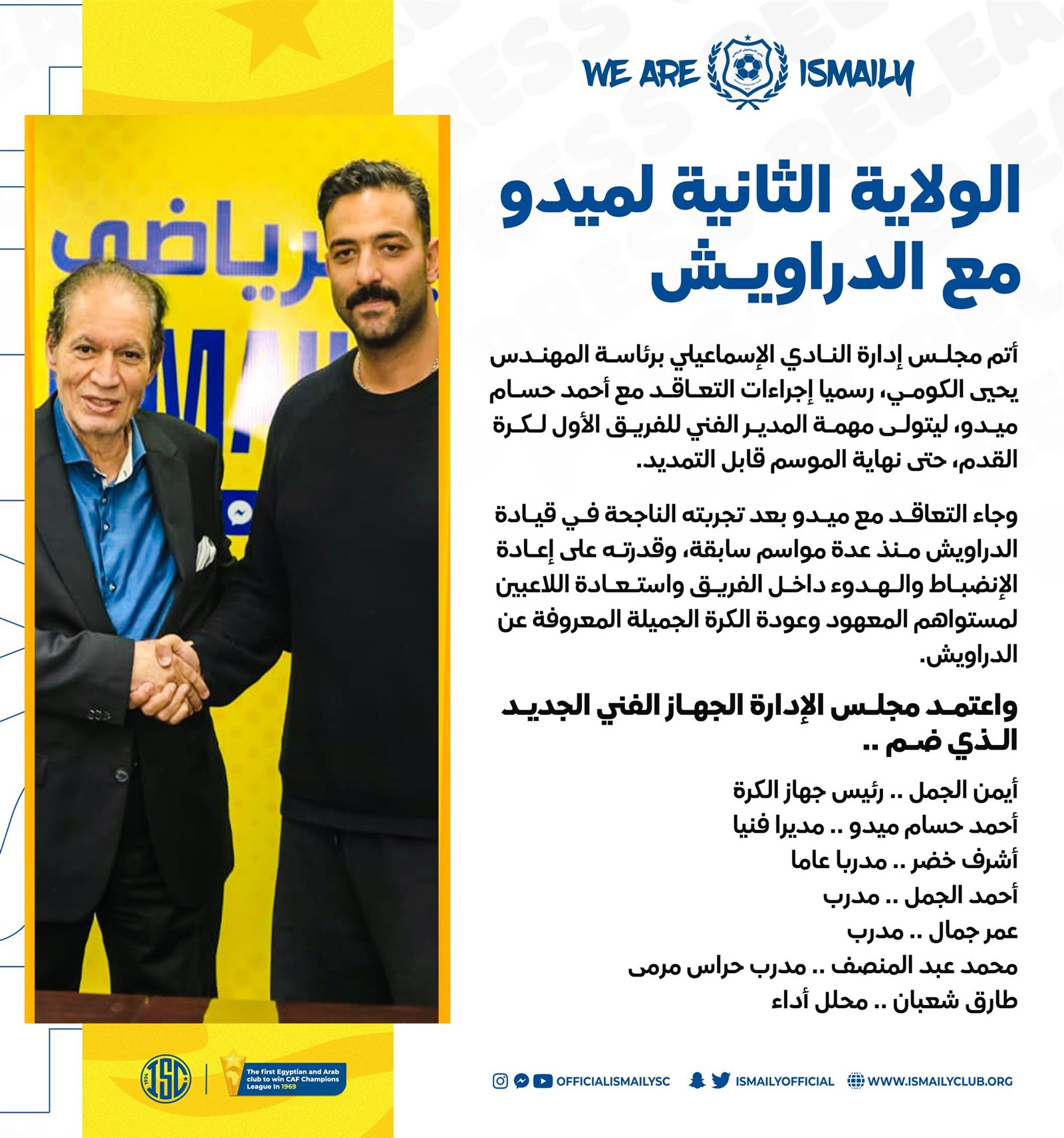 الإسماعيلي، نجح مجلس إدارة الدراويش في إتمام الاتفاق مع أحمد حسام ميدو، على تولي تدريب الفريق خلال الفترة الحالية، وذلك عقب تواجده في مقر النادي، اليوم الثلاثاء.