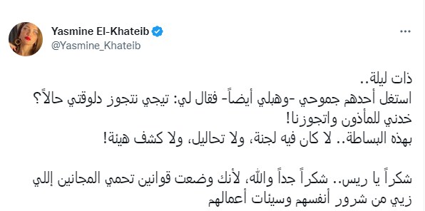 وكتبت ياسمين الخطيب تغريدة عبر تويتر عن قانون الأحوال الشخصية الجديد فقالت: "ذات ليلة.. استغل أحدهم جموحي- وهبلي أيضًا- فقال لي: تيجي نتجوز دلوقتي حالًا؟ خدني للمأذون واتجوزنا! بهذه البساطة.. لا كان فيه لجنة، ولا تحاليل، ولا كشف هيئة!".