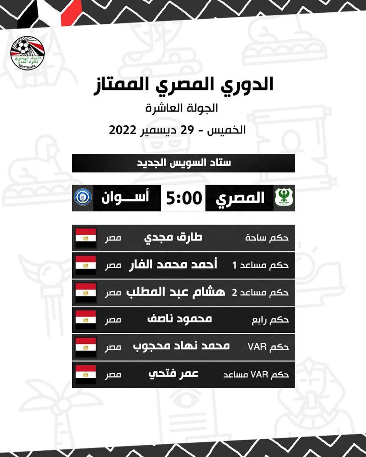 الدوري الممتاز، أعلنت لجنة الحكام الرئيسية باتحاد الكرة عن حكام مباريات غدا الأربعاء، في إطار منافسات الجولة العاشرة في الدوري الممتاز، وهي الزمالك أمام الإسماعيلي والتي تنطلق في السابعة مساء على استاد القاهرة الدولي، والمصري مع أسوان، والتي تنطلق في الخامسة مساء على استاد السويس الجديد.