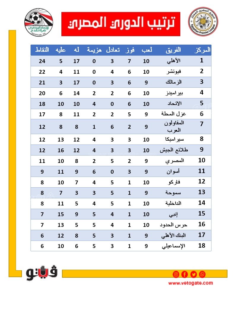 ترتيب الدوري المصري، تنشر فيتو جدول ترتيب الدوري المصري الممتاز بعد تعادل الأهلي مع سيراميكا كليوباترا في الجولة العاشرة لمسابقة الدوري المصري.