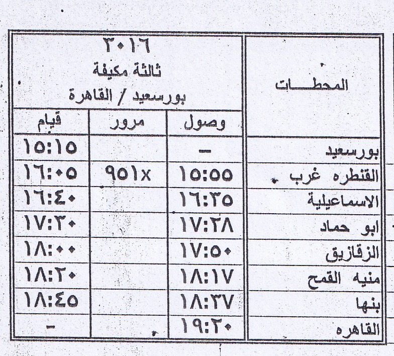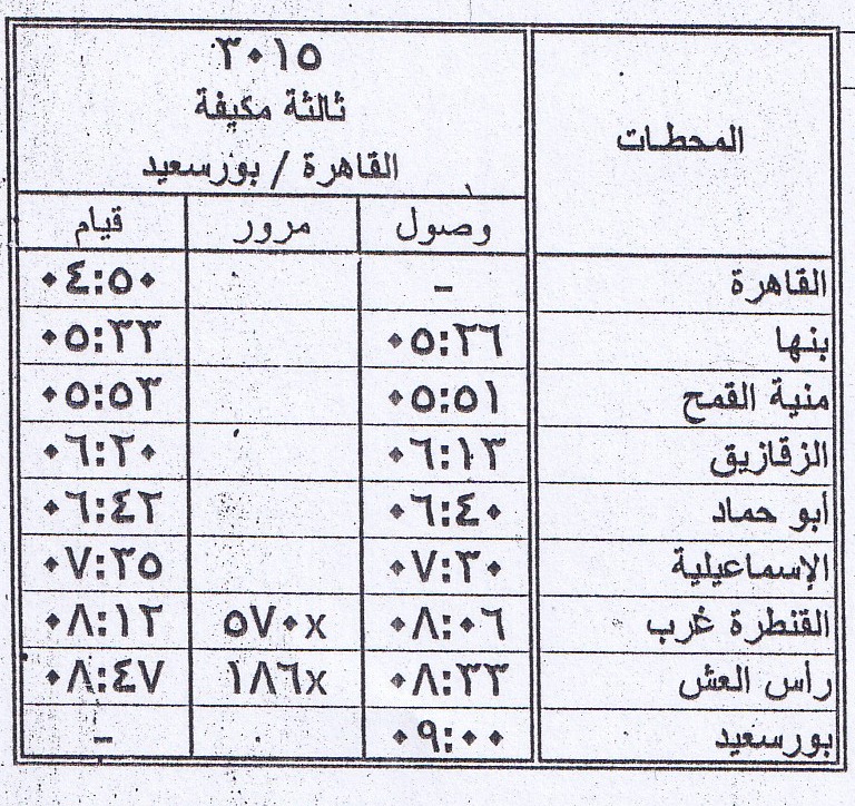 ويتم تشغيل قطار 3015 مكيف القاهرة / بورسعيد يقوم من محطة القاهرة الساعة 04.50 يصل لمحطة بورسعيد 09.00 طبقا للجدول المرفق.