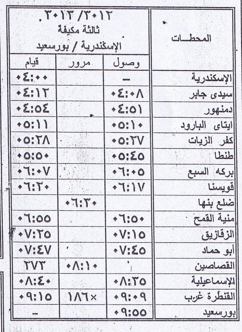 واعتبارا من يوم الأحد الموافق 1 / 1 / 2023 سيتم تشغيل قطار 3012/3013 مكيف الإسكندرية / بورسعيد (طريق بركة السبع قويسنا ) دون دخوله محطة بنها ويقوم من محطة الإسكندرية الساعة 04.00 يصل لمحطة بورسعيد 09.55 طبقا للجدول المرفق وتشغيل قطار 3016 مكيف بورسعيد / القاهرة يقوم من محطة بورسعيد الساعة 15.15 يصل لمحطة القاهرة 19.20 طبقا للجدول المرفق.