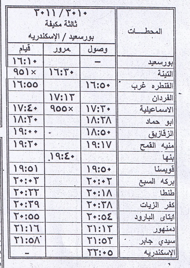 وتشغيل قطار 3010/3011 مكيف بورسعيد / الإسكندرية (طريق قويسنا بركة السبع ) دون دخوله محطة بنها ويقوم من محطة بورسعيد الساعة 16.10 يصل لمحطة الإسكندرية 22.05 طبقا للجدول المرفق.