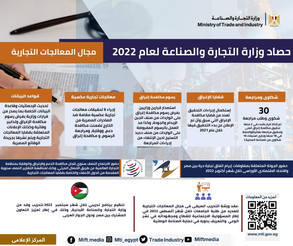 وتتضمن حصاد المعالجات التجارية التابع لوزارة التجارة والصناعة "حضور الجولة المتعلقة بمفاوضات إبرام اتفاق تجارة حرة بين مصر والاتحاد الاقتصادي الأوراسي خلال شهر أكتوبر 2022، وحضور الاجتماع النصف سنوي للجان مكافحة الحكم والإغراق والوقاية بمنظمة التجارة العالمية عن طريق الاتصال المرئي وذلك لمناقشة التقارير النصف سنوية المقدمة من الدول الأعضاء والخاصة بقضايا المعالجات التجارية.