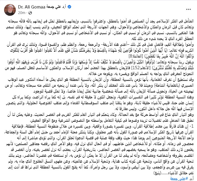وكتب الدكتور على جمعة، عبر صفحته الرسمية بالفيس بوك، في شأن الفكر الإسلامي "إن المتأمل في الفكر الإسلامي يجد أن المسلمين قد آمنوا بالمطلق، واعترفوا بالنسبي، وإيمانهم بالمطلق تمثل في إيمانهم بالله فالله سبحانه وتعالى كان قبل الزمان والمكان والأشخاص والأحوال".