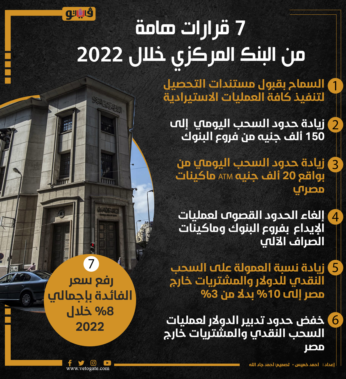 7 قرارات هامة من البنك المركزي خلال 2022 (إنفوجراف) الخميس 29/ديسمبر/2022 - 06:02 م 12/29/2022 6:02:40 PM البنك المركزي أحمد خميس شارك طباعة 18 حجم الخط شارك طباعة البنك المركزى مستندات التحصيل فروع البنوك ماكينات الصراف الآلي السحب النقدي للدولار تدبير الدولار سعر الفائدة