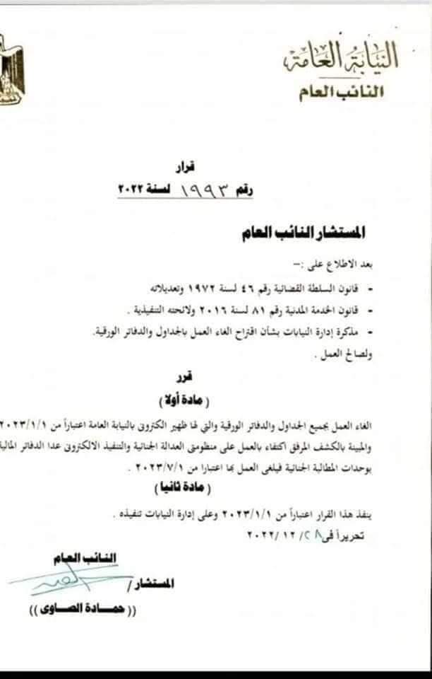 أصدر أمس المستشار حمادة الصاوي، النائب العام، قرارًا بإلغاء العمل بجميع الجداول والدفاتر الورقية بالنيابة العامة، اعتبارًا من الأول من شهر يناير المقبل، وهي تسعة جداول وستة عشر دفترًا بالنيابات الجنائية، اكتفاءً بالقيد والحصر الإلكتروني على منظومتي العدالة الجنائية الرقمية والتنفيذ الإلكتروني اللتين تعمل بهما النيابة العامة، بعد اكتمال تطويرها وانتظامها، وكذلك إلغاء العمل بالدفاتر المالية الورقية بوحدات المطالبة الجنائية اعتبارًا من اليوم الأول من شهر يوليو المقبل لارتباطها بالسنة المالية.