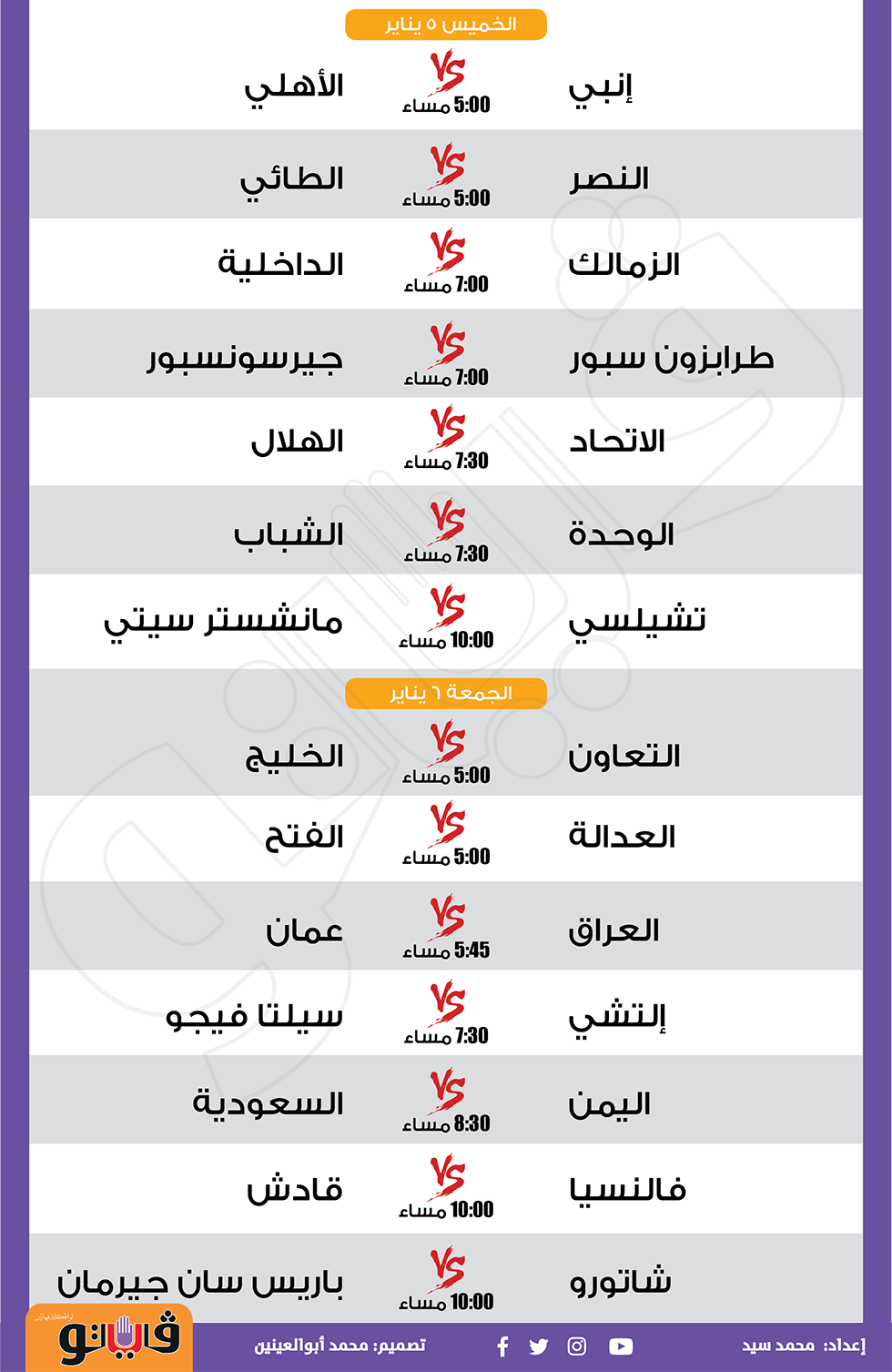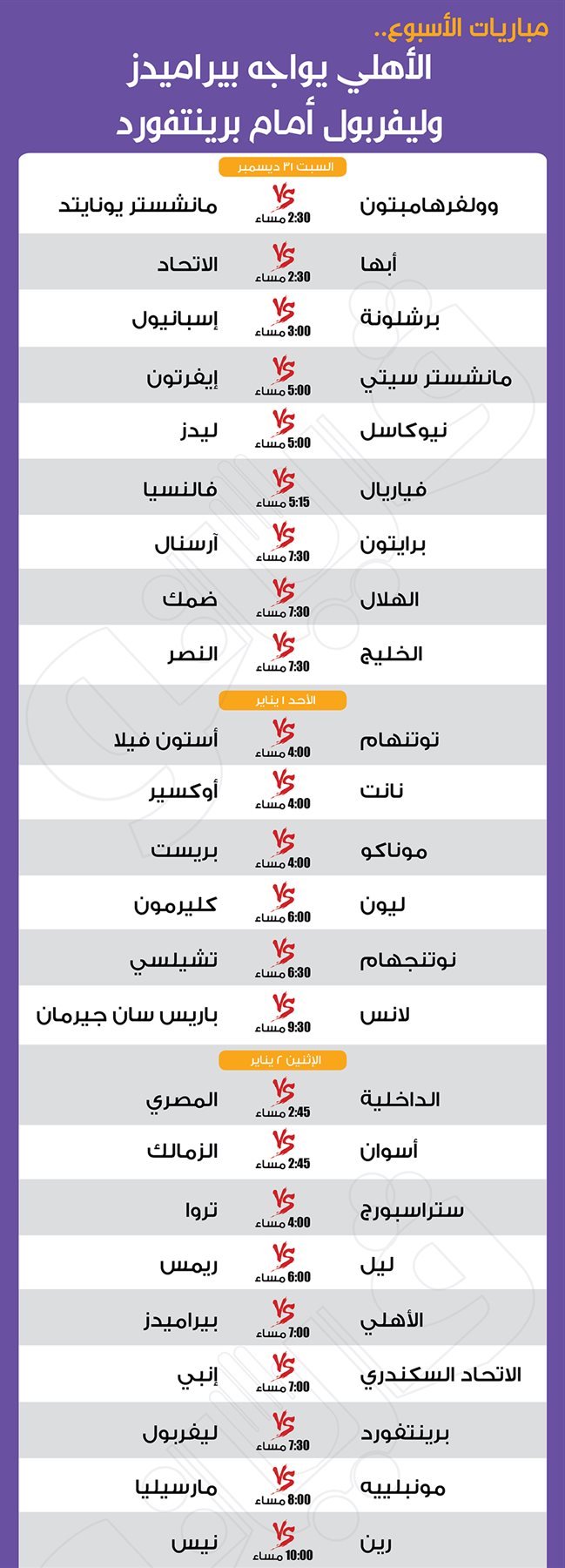 مباريات الأسبوع،الأهلي يواجه بيراميدز وليفربول أمام برينتفورد (إنفوجراف) الجمعة 30/ديسمبر/2022 - 01:55 م 12/30/2022 1:55:03 PM الأهلي وبيراميدز، فيتو محمد سيد شارك طباعة 18 حجم الخط شارك طباعة أرسنال الأهلي الزمالك ليفربول ريال مدريد برشلونة باريس سان جيرمان مانشستر سيتي