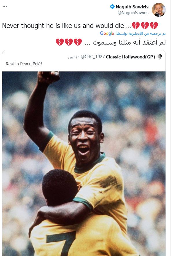 وغرد المهندس نجيب ساويرس عبر حسابه على تويتر عن وفاة بيليه قائلًا: لم أعتقد أنه مثلنا وسيموت.