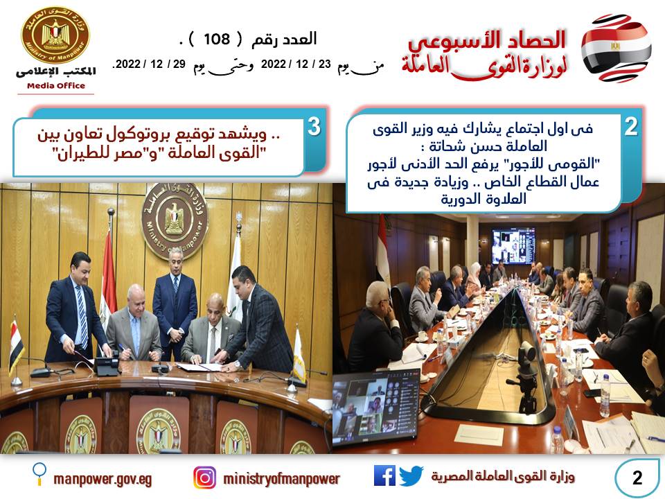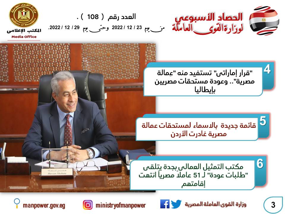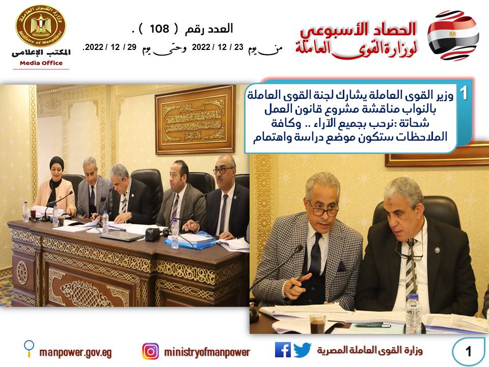حصاد الأسبوع تضمن أيضا نشاط مكاتب التمثيل العمالي في الخارج وعودة حقوق ومستحقات العمال المصريين في الخارج، كما نشطت مديريات القوى العاملة في كافة المحافظات في تنفيذ خطة التدريب الجديدة 2022-2023، لتأهيل وتدريب الشباب على مهن يحتاجها سوق العمل.