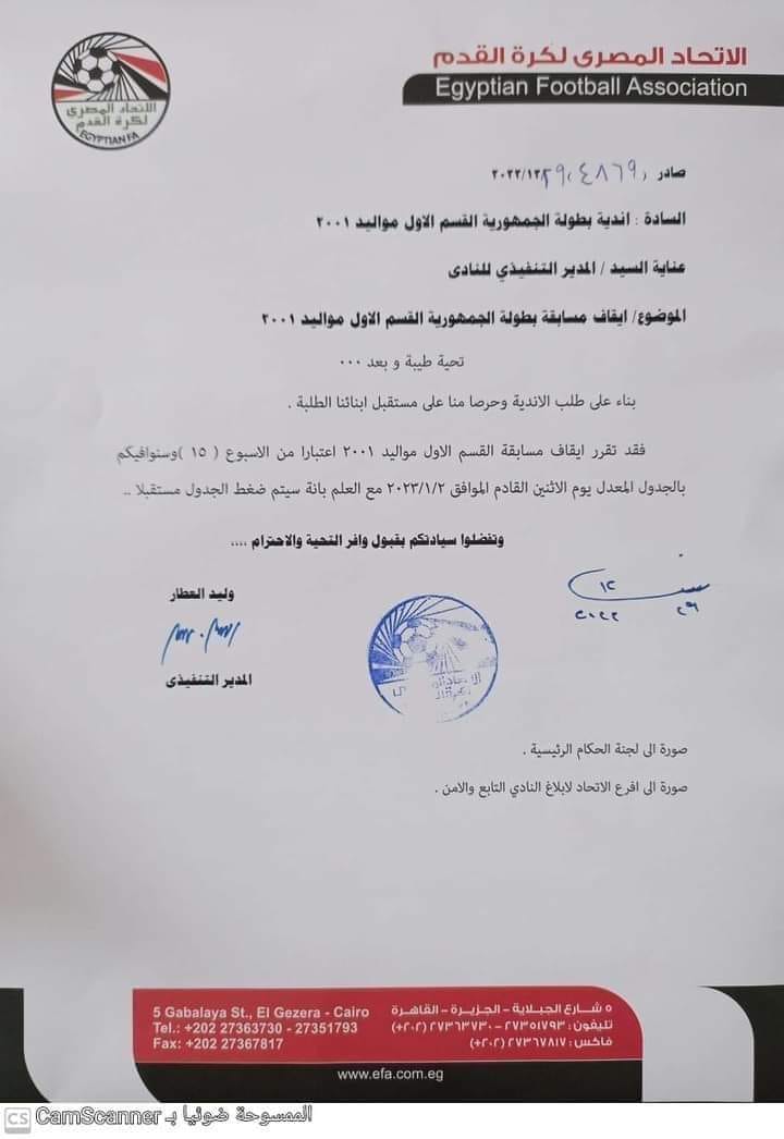 وأكدت الجبلاية:" بناءً على طلب الأندية وحرصًا منا على مستقبل أبنائنا الطلبة، فقد تقرر إيقاف مسابقة القسم الأول دوري الجمهورية للشباب مواليد 2001 اعتبارا من الأسبوع ” 15 ”.