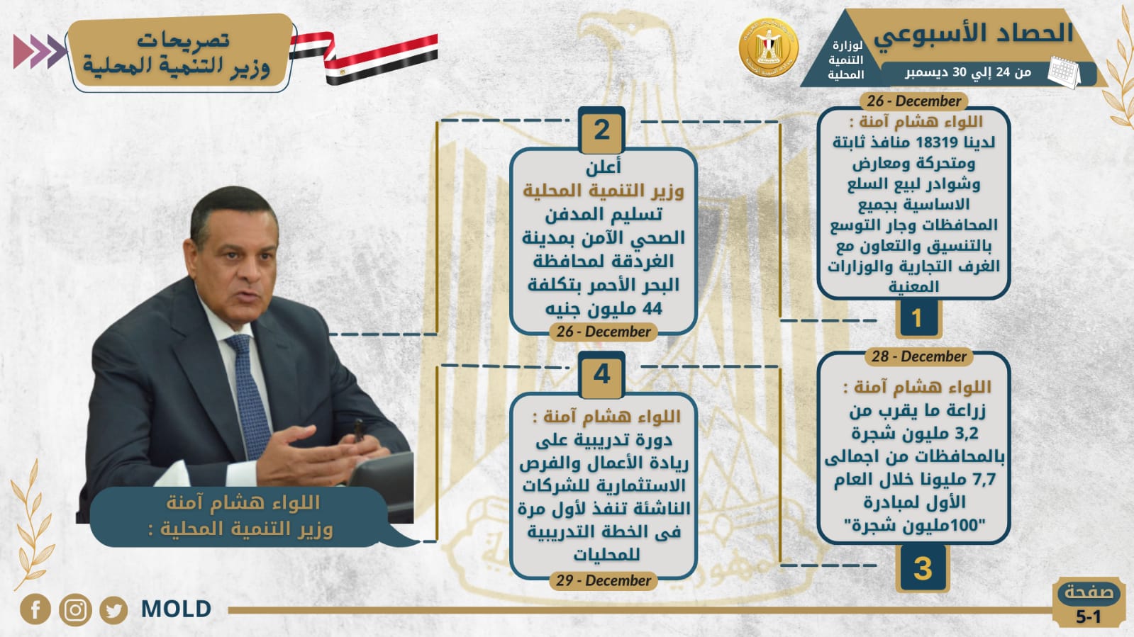 أصدر المركز الإعلامي، التابع لوزارة التنمية المحلية، "الانفوجراف الأسبوعي" في نسخته الرابعة عشر حول حصاد أهم الأنشطة والفعاليات التي قام بها اللواء هشام آمنة وزير التنمية المحلية، خلال الأسبوع الماضي في الفترة من 24 إلي 30 ديسمبر الجاري، حيث نستعرض أبرزها في التقرير التالي الذي نشرته الصفحة الرسمية لوزارة التنمية المحلية على موقع التواصل الاجتماعي"فيس بوك" من خلال انفوجراف يرصد أبرز تلك الأنشطة التي جاءت كالتالي: