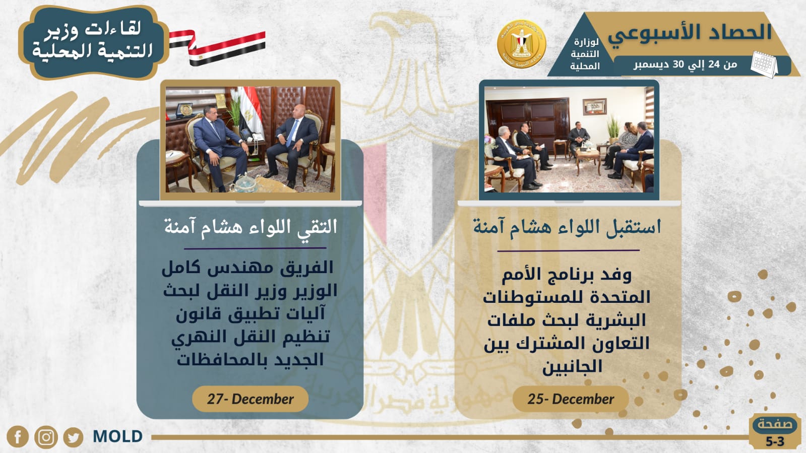جهود وزارة التنمية المحلية في تعزيز التعاون مع الشركاء الدوليين في مصر لتنفيذ البرامج والمشروعات التنموية بالمحافظات، حيث تم نقل تجربة " حياة كريمة " للدول الأفريقية لتحقيق طموحات شعوب القارة.. والاستعداد لاستضافة المنتدى الحضرى العالمى.