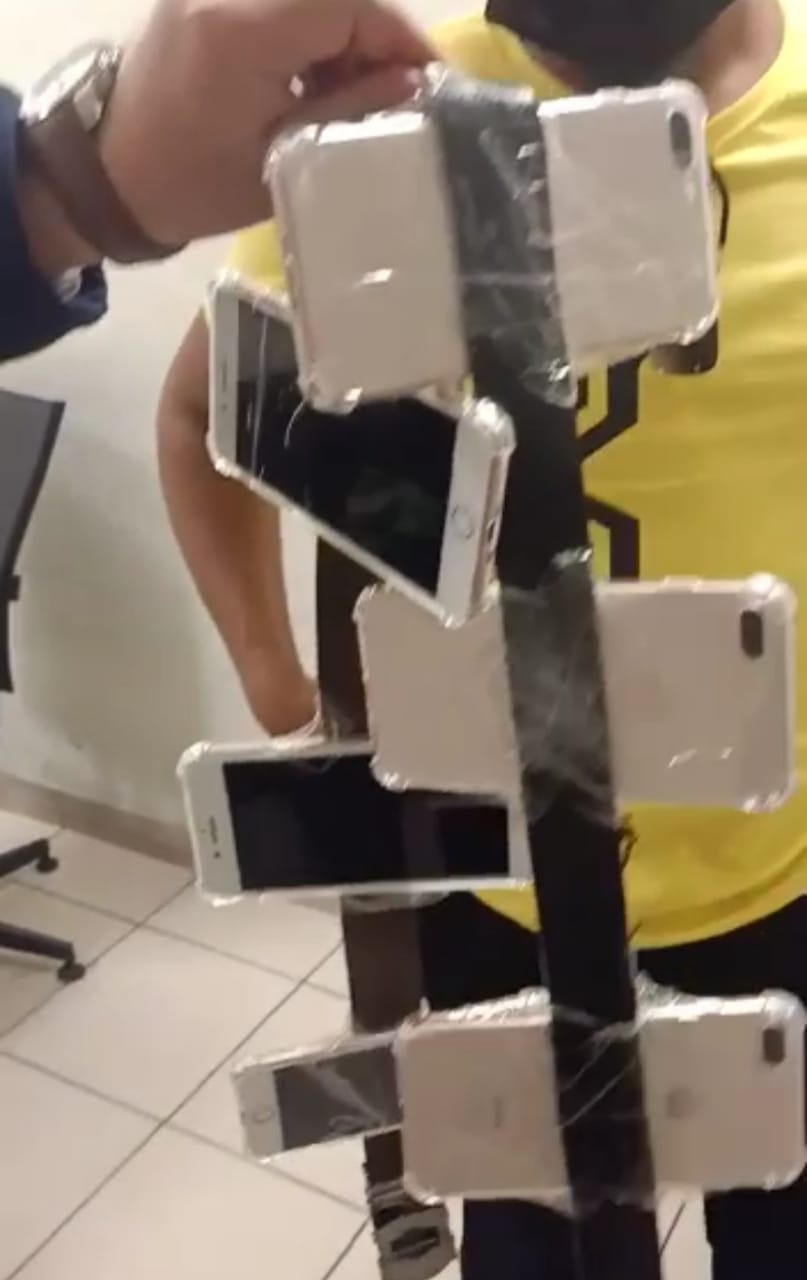 وبتفتيش حقائبه على جهاز الفحص بالأشعة لم يسفر التفتيش عن وجود شيء مخالف إلا أنه تلاحظ لمحمود أحمد عبد المطلب مأمور الجمرك اهتزاز الراكب وارتباكة وتعرقه ومحاولته الخروج بسرعة من الصالة فقام بعرض الأمر علي محمود سعيد جوهر مدير الحركة المشرف على صالة الوصول بمبنى الركاب رقم 2 والذي كلف "عبد المطلب" بتفتيش الراكب ذاتيا مما أسفر عن وجود 17 تليفون محمول ماركة iPhone حديث أخفاهم الراكب حول جسمه بلصقهم جزء حول رجليه وجزء آخر ثبته في حزام البنطلون الذي يرتديه وأسفله.