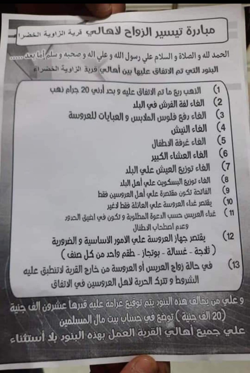 وحّدد الأهالي القائمين على اقتراح بنود المبادرة وآلية تنفيذها، تطبيق غرامة قدرها 20 ألف جنيه على كل من يخالف تنفيذ بنود المبادرة، على أن توضع قيمة الشرط الجزائي بصندوق بيت المال بالقرية لمساعدة الفتيات الأيتام وغير القادرات.