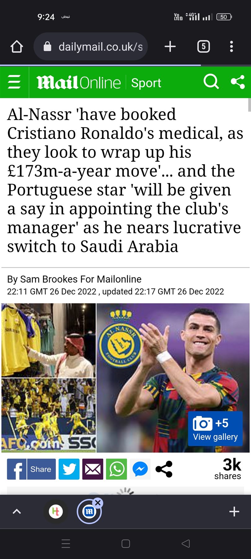 ونشرت صحيفة «سبق» السعودية نبأ انتقال كريستيانو رونالدو إلي نادي النصر، فيما أشارت صحيفة «البلاد» السعودية، إلى أن (كريستيانو رونالدو نصراوي حتى عام 2025).