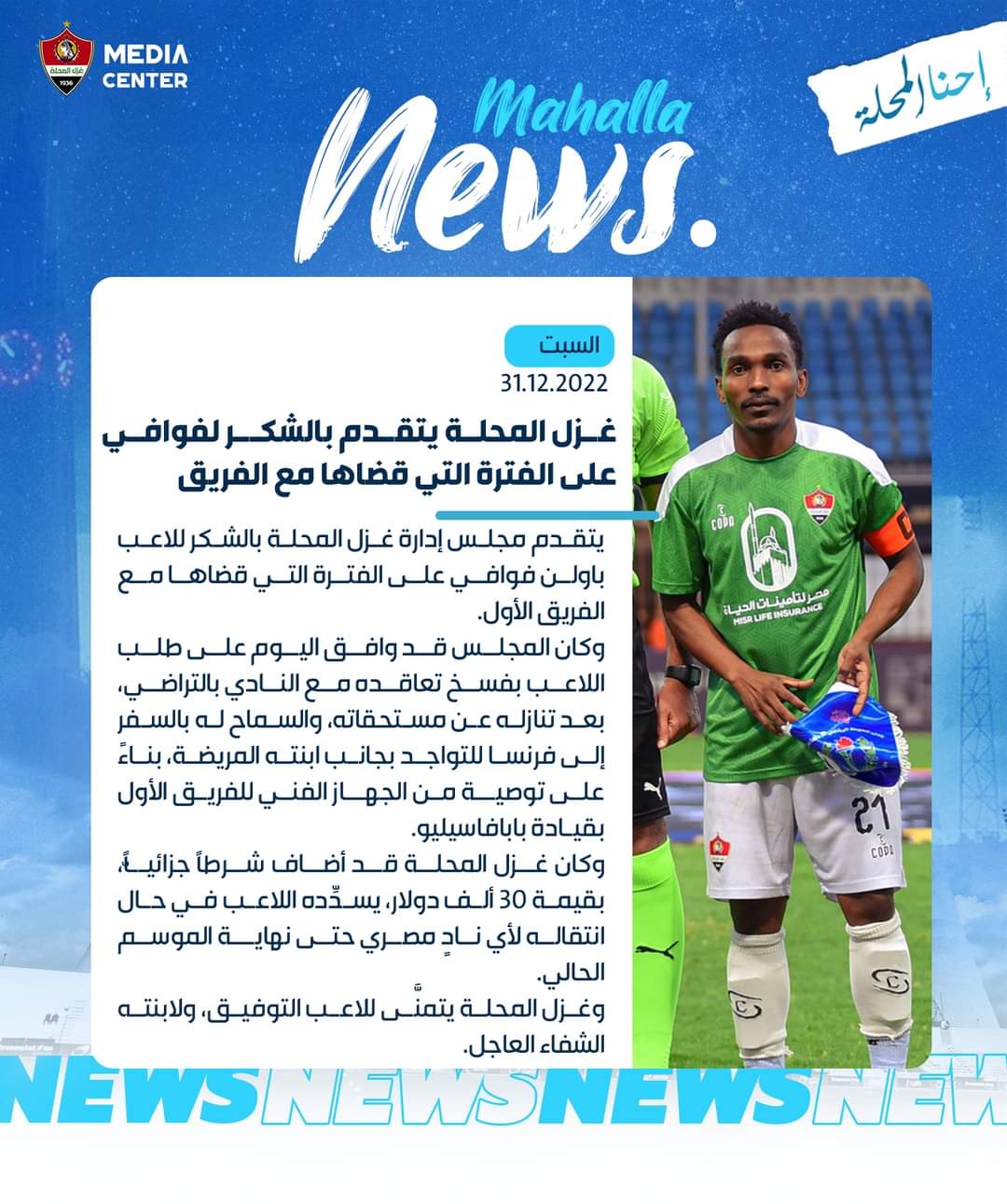 الدوري المصري ، تقدم مجلس إدارة نادي غزل المحلة بالشكر للاعب باولن فوافي على الفترة التي قضاها مع الفريق الأول.