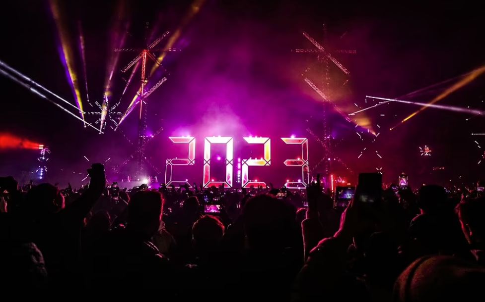 واحتشد المحتفلون على ضفاف نهر التايمز في وقت مبكر من المساء، قبل بدء الألعاب النارية التقليدية في لندن التي أضاءت السماء في منتصف الليل (تكريمًا للملكة الراحلة ودعما لمقاومة أوكرانيا ضد الغزو الروسي).