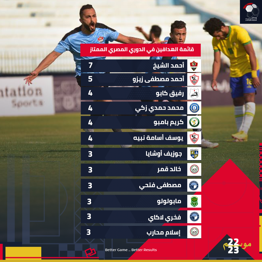 بينما تساوى كلا من كريم بامبو لاعب البنك الأهلي ويوسف أسامة نبيه لاعب الزمالك ومحمد حمدي زكي لاعب أسوان ورفيق كابو لاعب انبي برصيد 4 أهداف في قائمة ترتيب هداف الدوري الممتاز قبل انطلاق الجولة الـ11 للمسابقة.