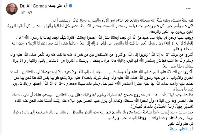 بداية عام جديد 2023، علي جمعة يقترح مشروعا لتصحيح المسار بعد البلاء