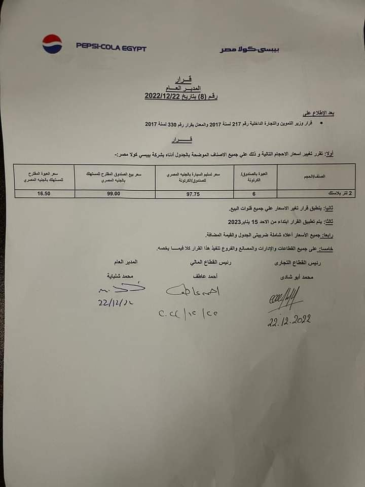 1- رفع سعر عبوة بيبسي 195 ملي جرام زجاج إلى 3.75 جنيه