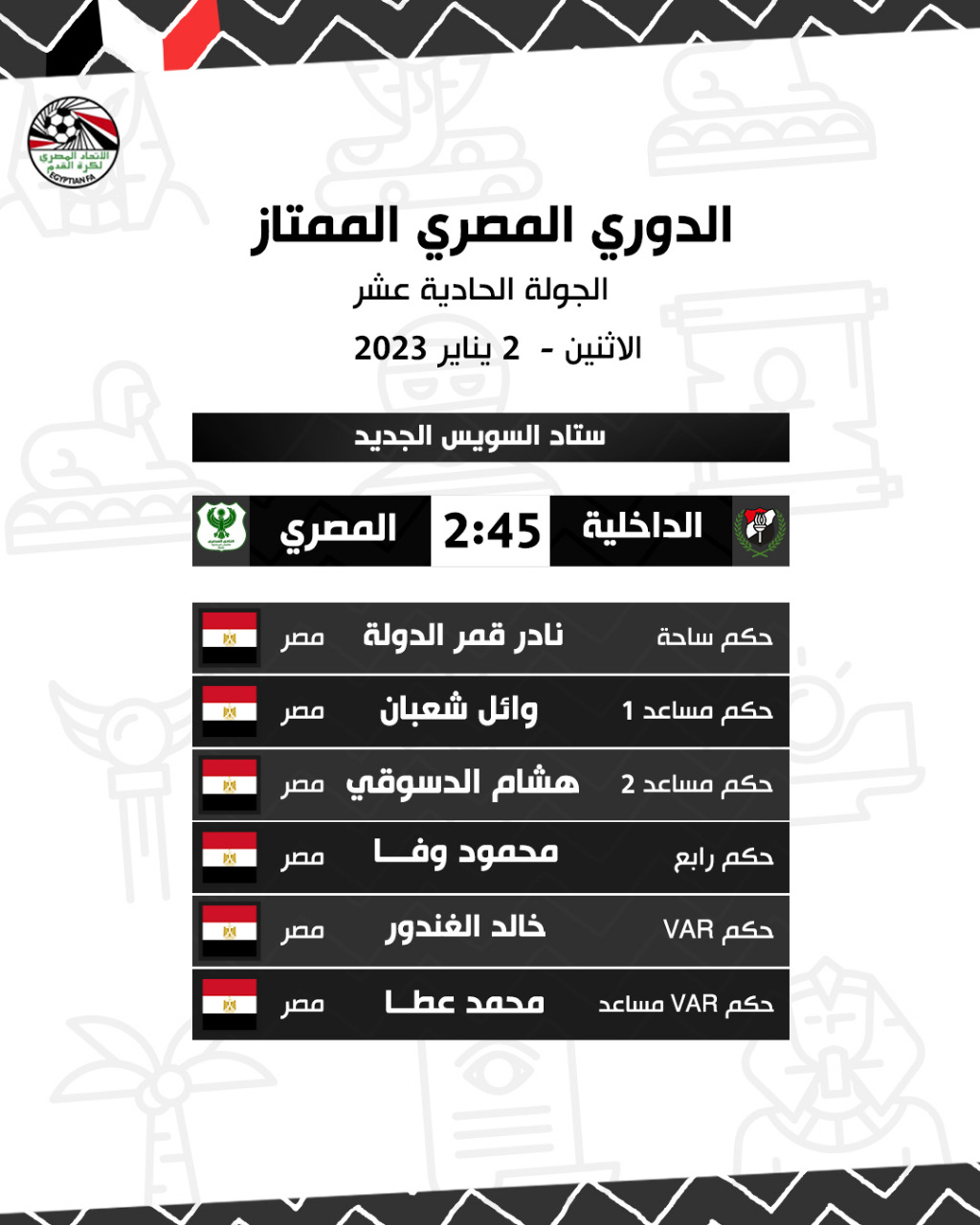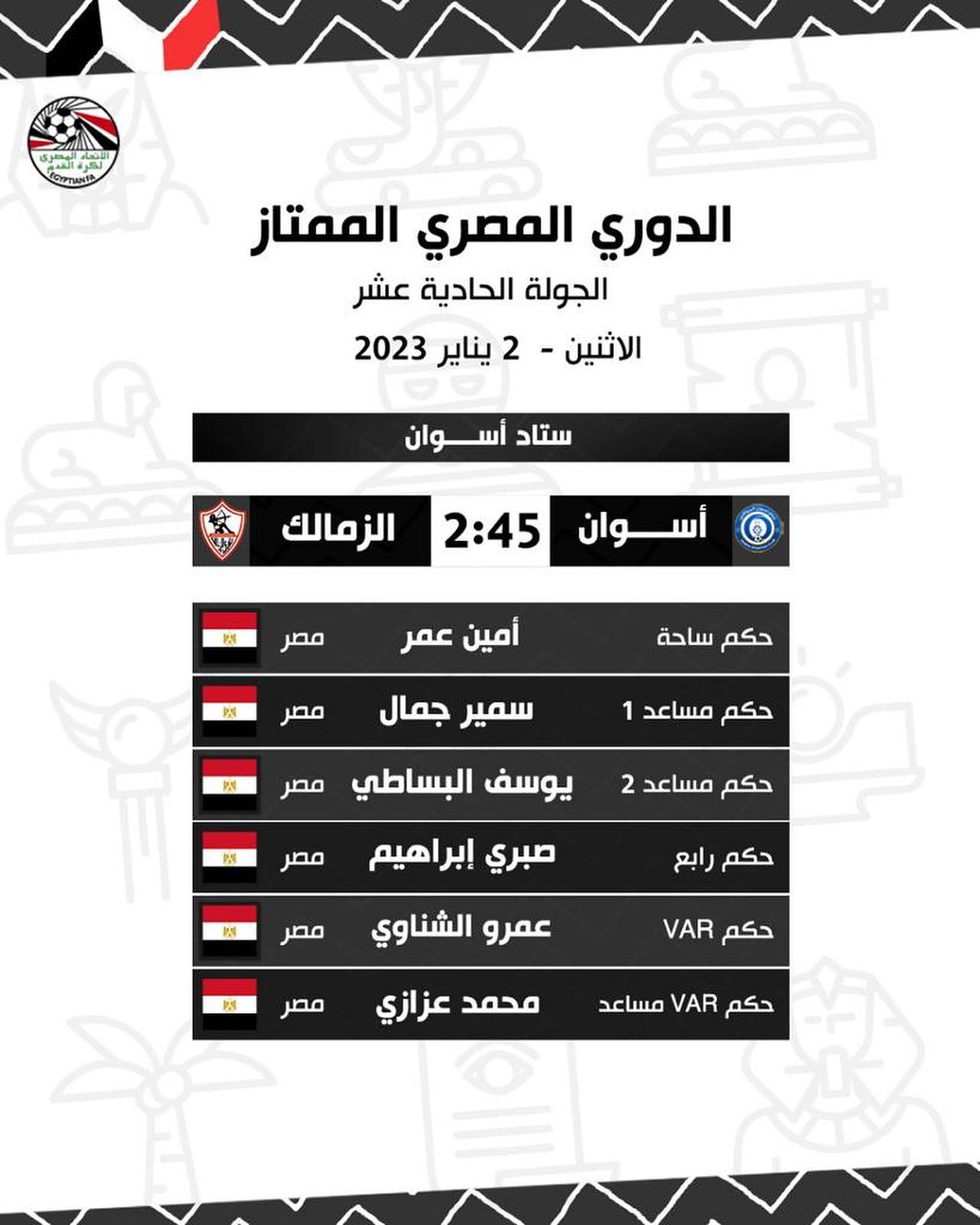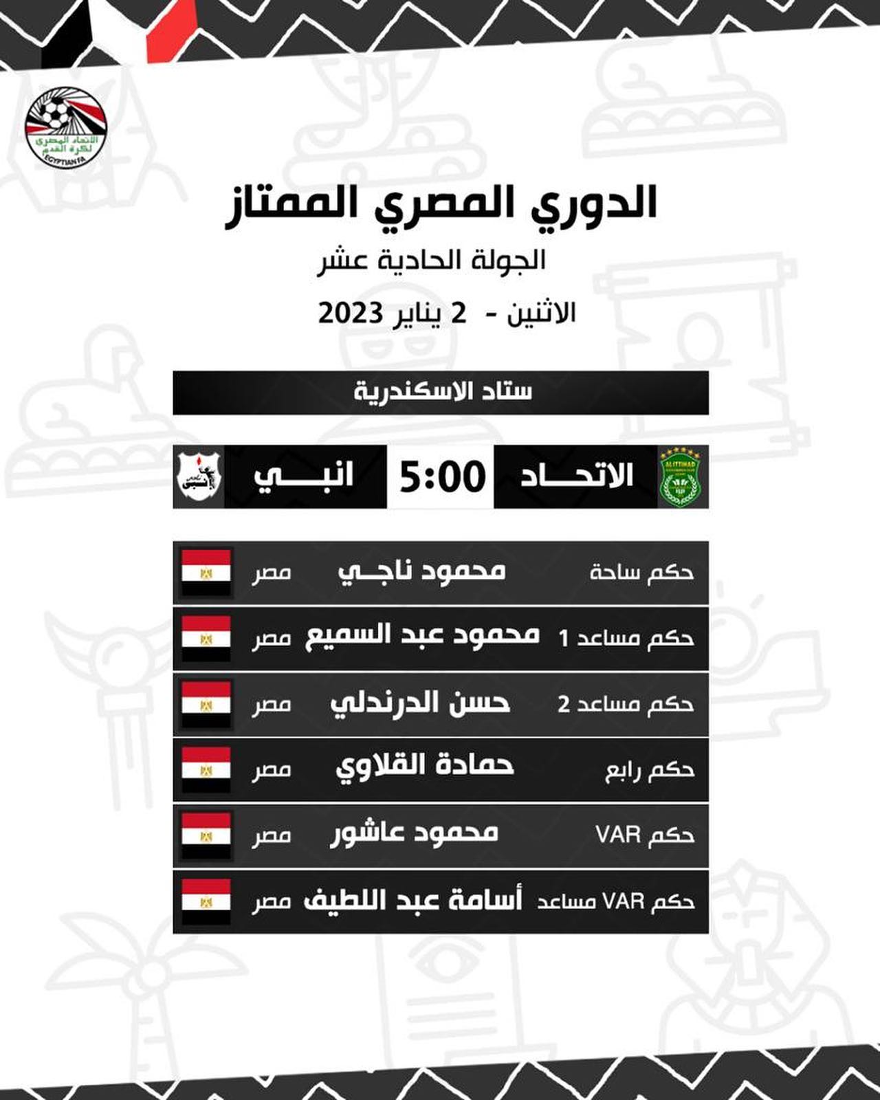 الدوري الممتاز، أعلنت لجنة الحكام الرئيسية بإتحاد الكرة حكام مباريات غدا الإثنين، في ختام الجولة الحادية عشرة من الدوري الممتاز، على النحو التالي: