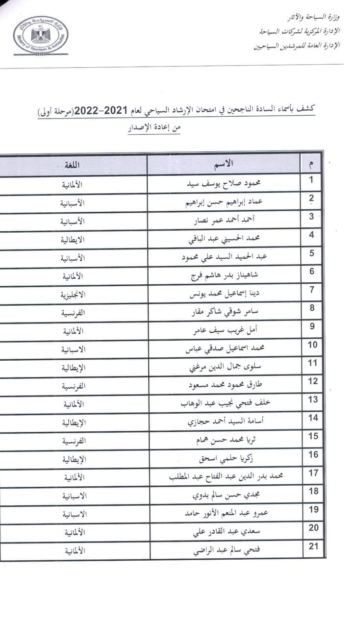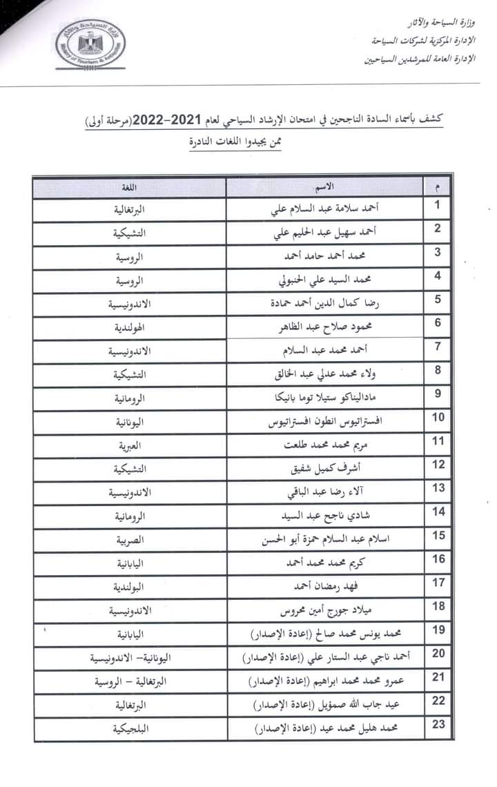 بالأسماء، نتيجة امتحان اللغات النادرة للمرشدين السياحيين